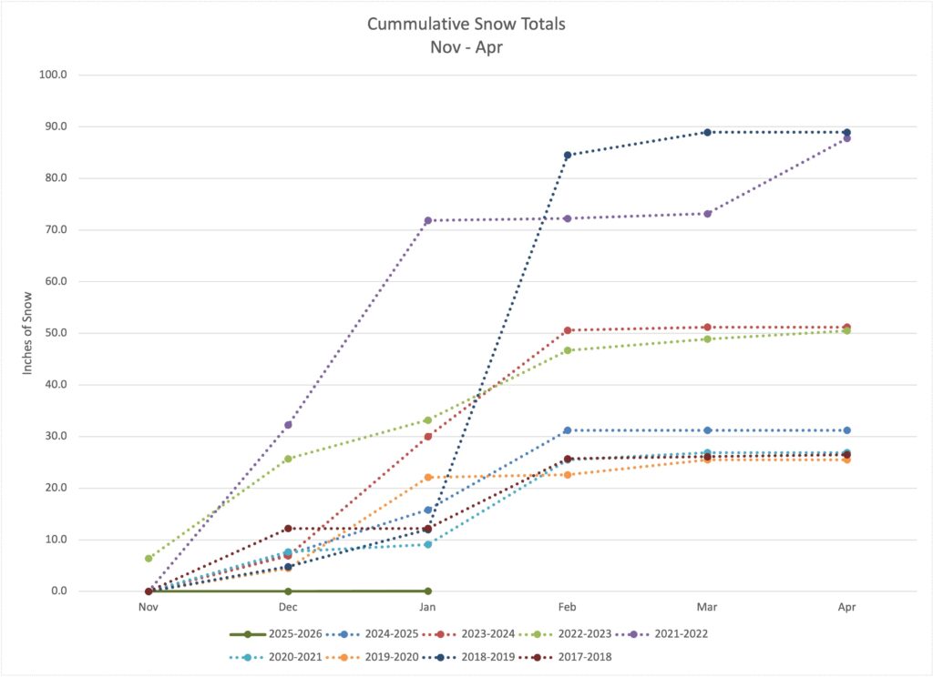 | Month | 2025-2026 Precip | 2025-2026 Snow | 2024-2025 Precip | 2024-2025 Snow | 2023-2024 Precip | 2023-2024 Snow | 2022-2023 Precip | 2022-2023 Snow | 2021-2022 Precip | 2021-2022 Snow | 2020-2021 Precip | 2020-2021 Snow | 2019-2020 Precip | 2019-2020 Snow | 2018-2019 Precip | 2018-2019 Snow | 2017-2018 Precip | 2017-2018 Snow |